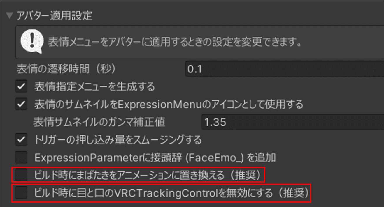 - ビルド時に目と口のVRCTrackingControlを無効にする(推奨)