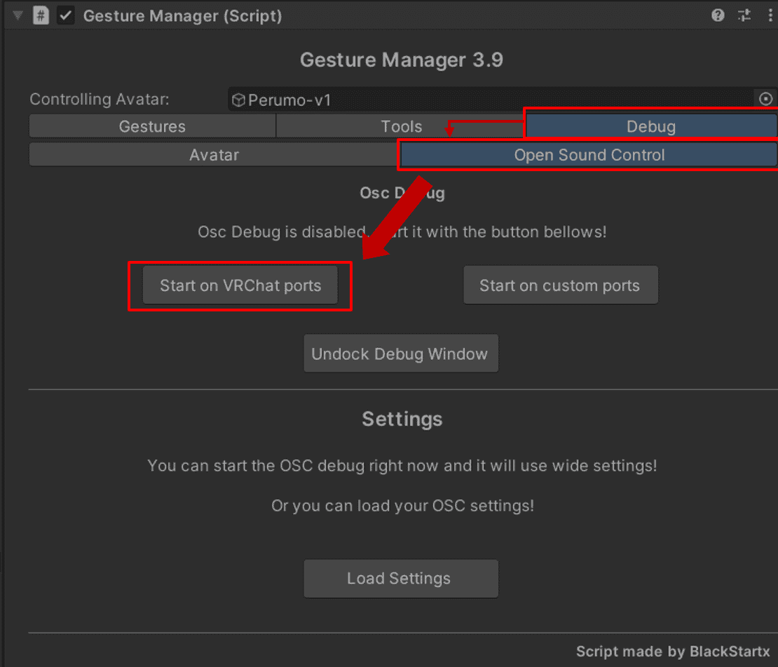 GestureManagerの画面から「Debug」>「Open Sound Control」に進み、「Start on VRChat ports」を選択します。