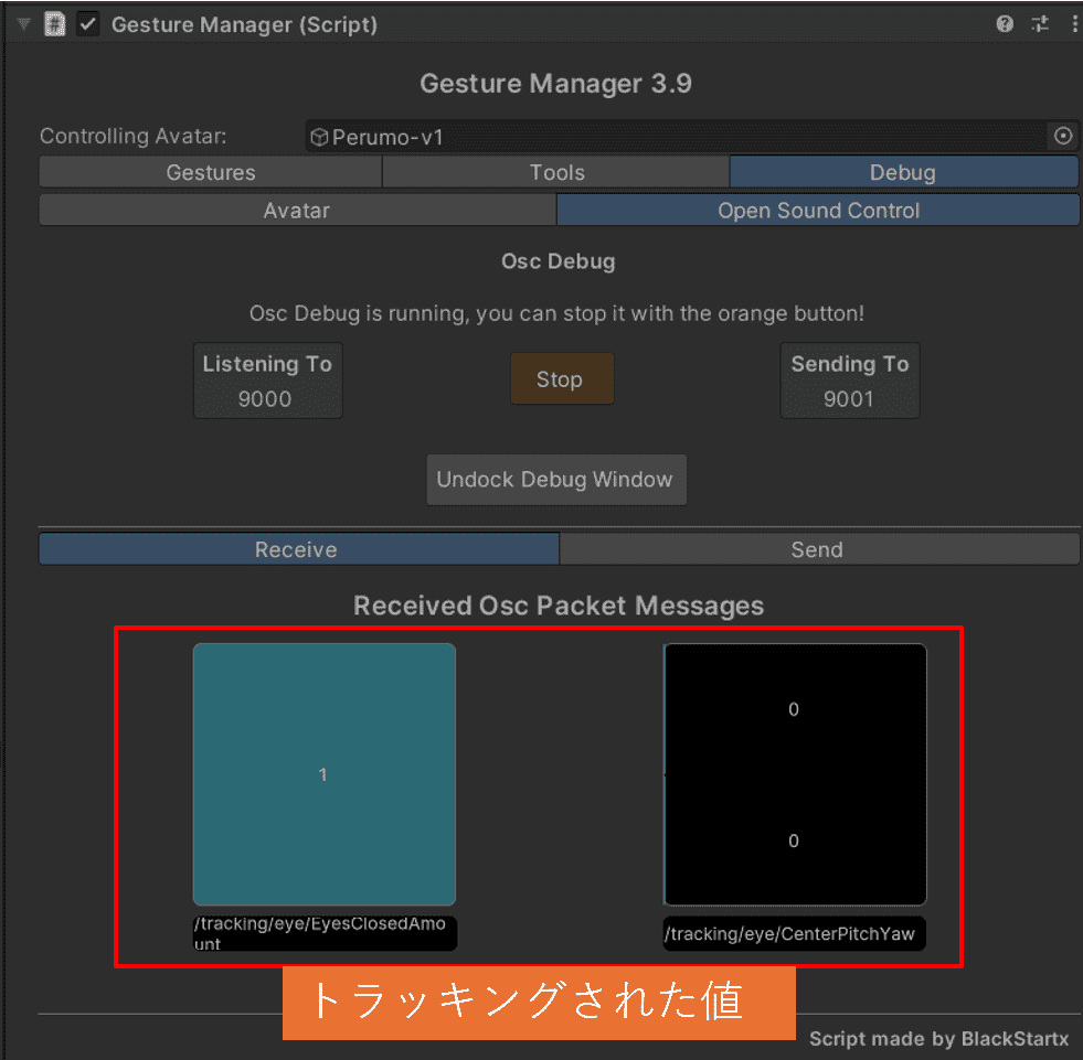 うまくいえけばの画像の通り「Receuved Osc Packet Messages」に顔トラで収集されたパラメータ値が表示され、UnityのSceneビュー上でアバターの表情が確認できると思います。