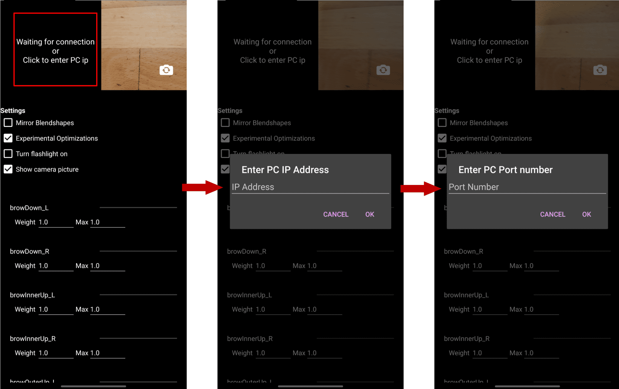 「Waiting for connection or Click to enter PC ip」と書かれている場所をタップし、先程確認したパソコンのIPアドレスとポート番号を順に入力します。