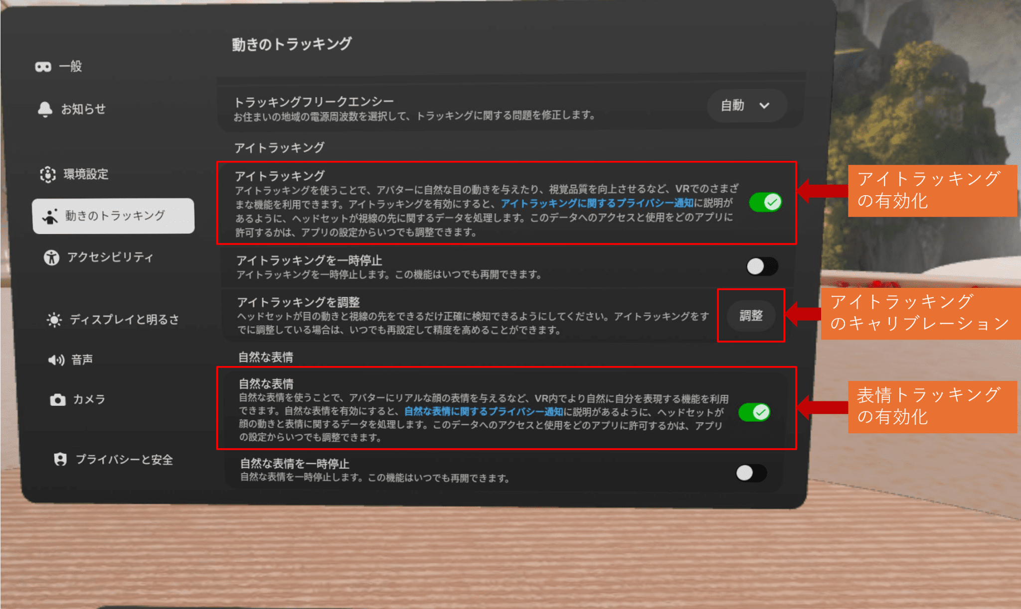 画面最下部にある「アイトラッキング」がアイトラ機能、「自然な表情」が表情トラッキング機能になります。それぞれ有効化しましょう。
