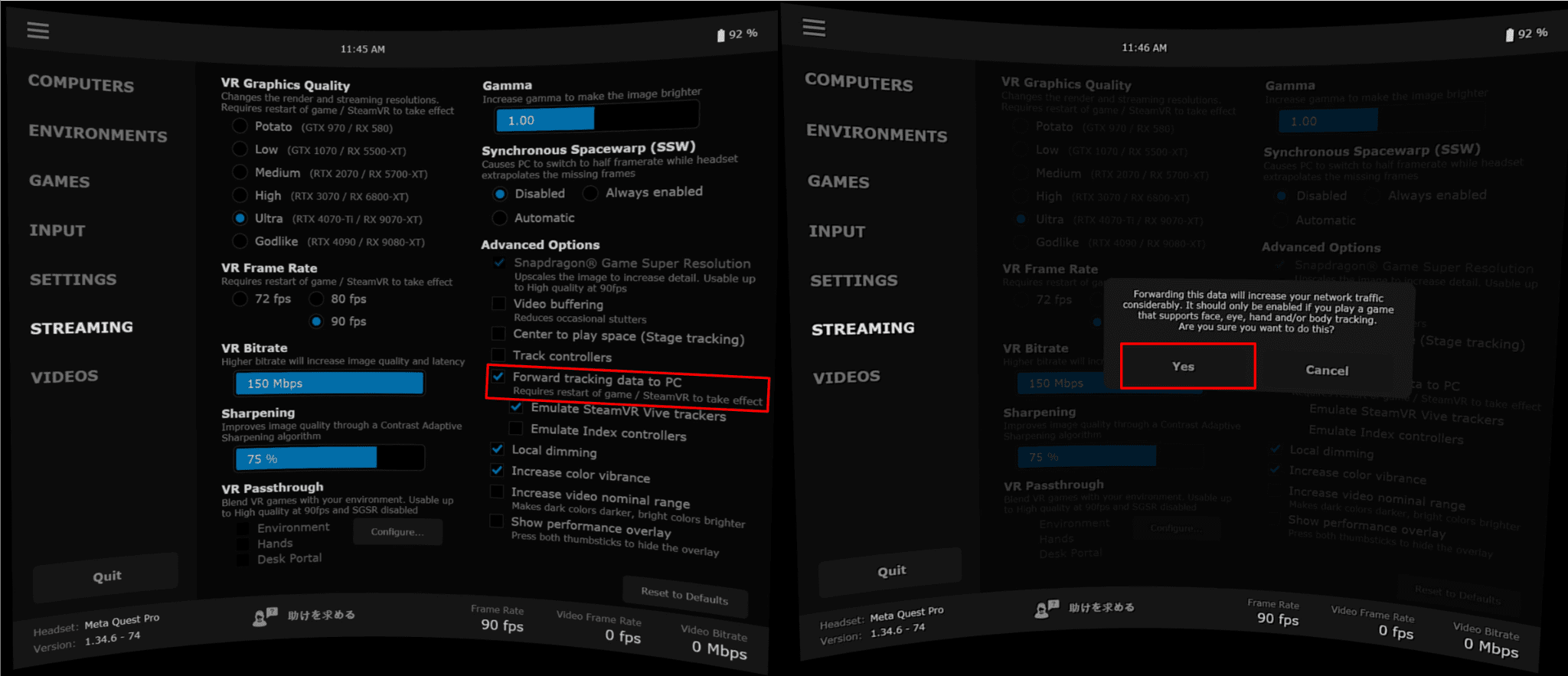 VirtualDesktopを起動し、「Streaming」から「Forward tracking data to PC」を有効化します。