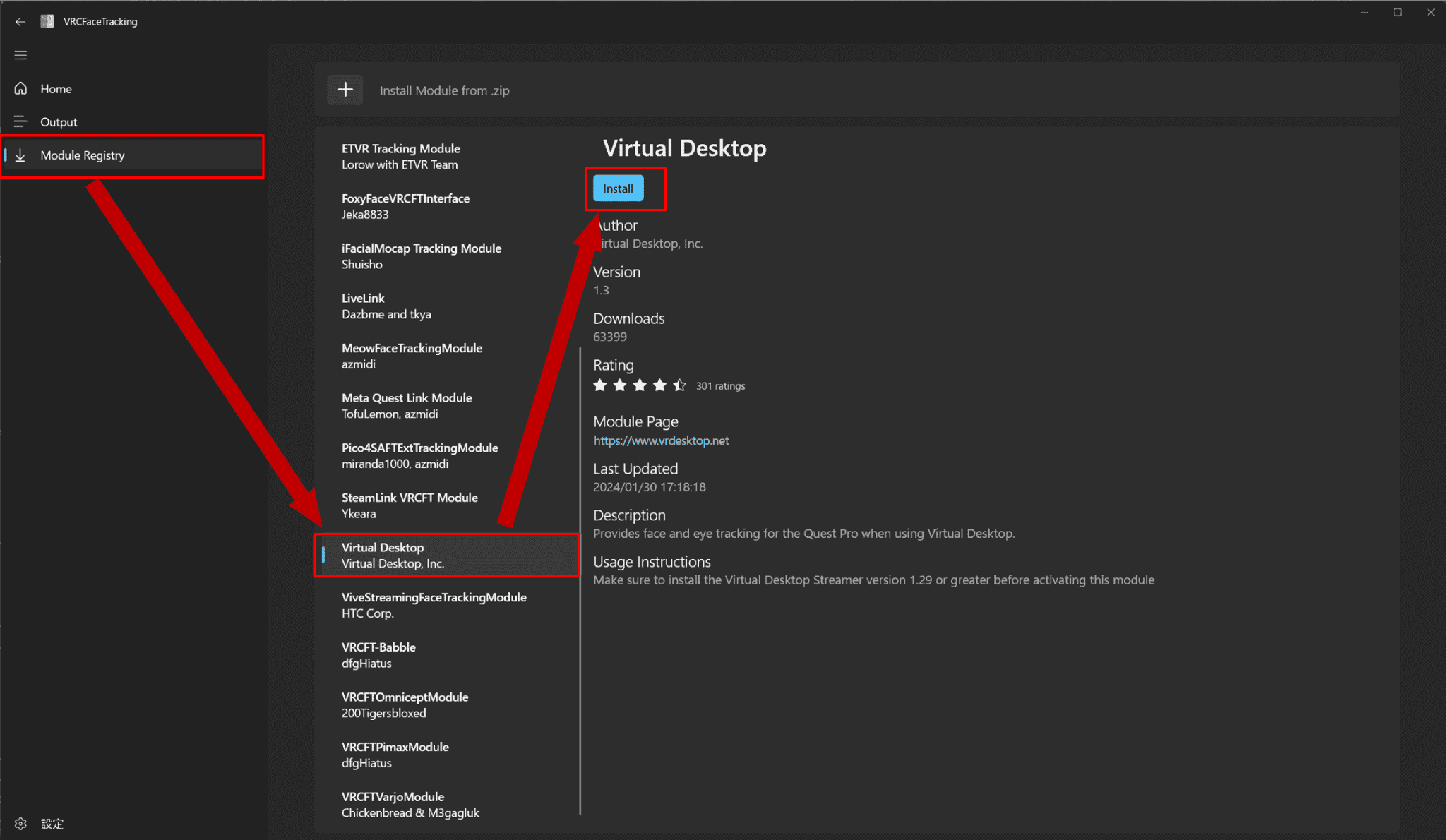 VRCFaceTrackingをインストールしたら、「Module Registry」からVirtualDesktop用のモジュールを探してインストールしましょう。