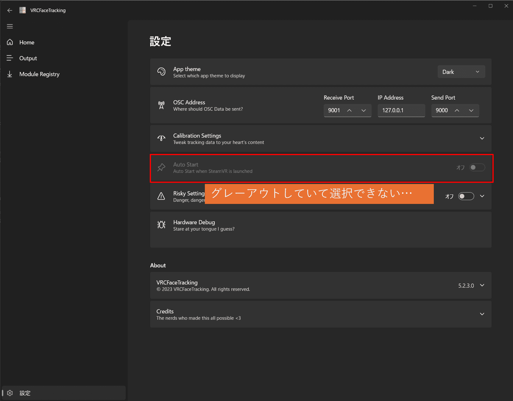 VRCFaceTrackingの設定を開くと「Auto start」という項目がありますが、グレーアウトしていて選択できません。