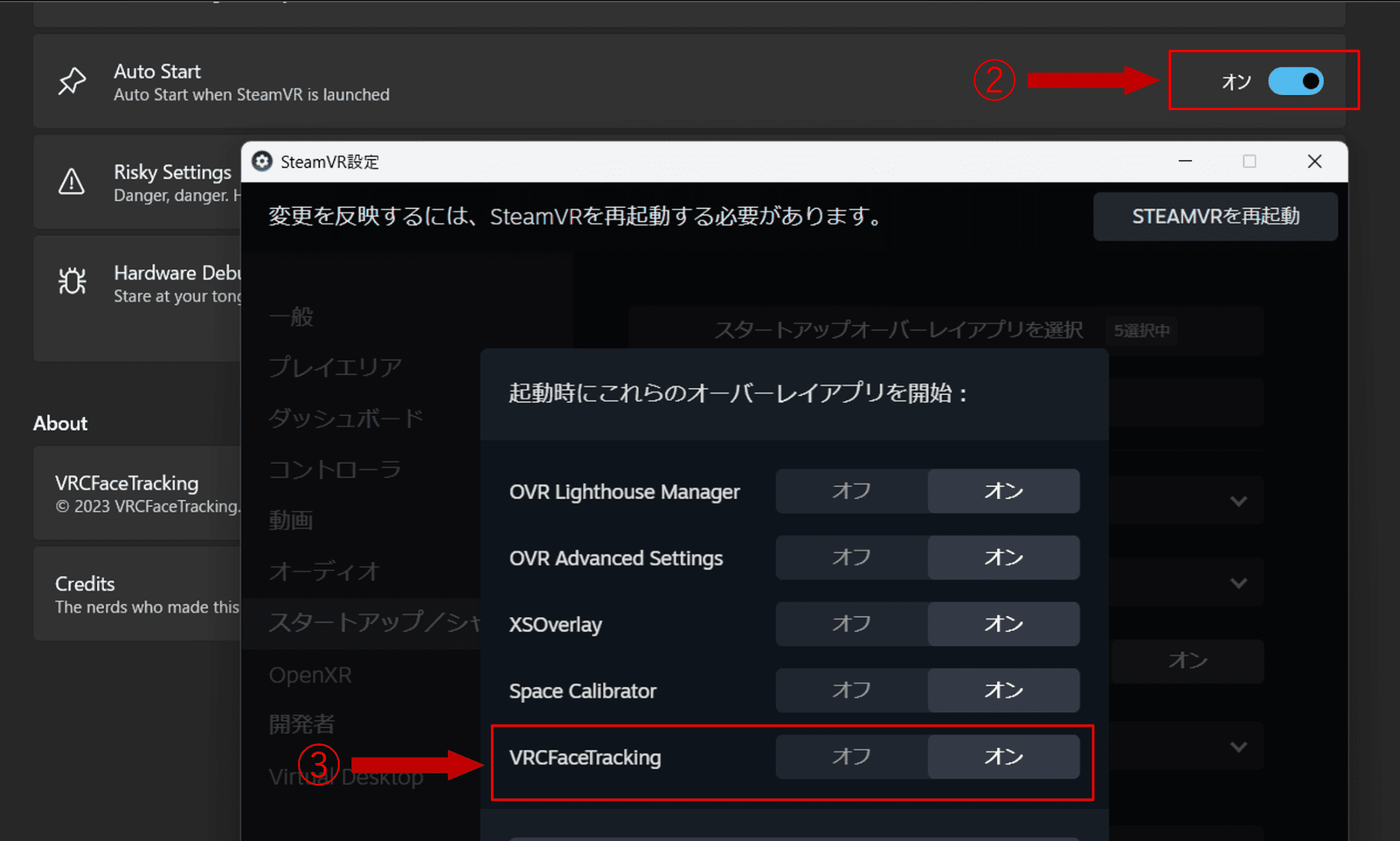 - SteamVR設定の「スタートアップオーバーレイアプリを選択」からVRCFaceTrackingをオンに変更