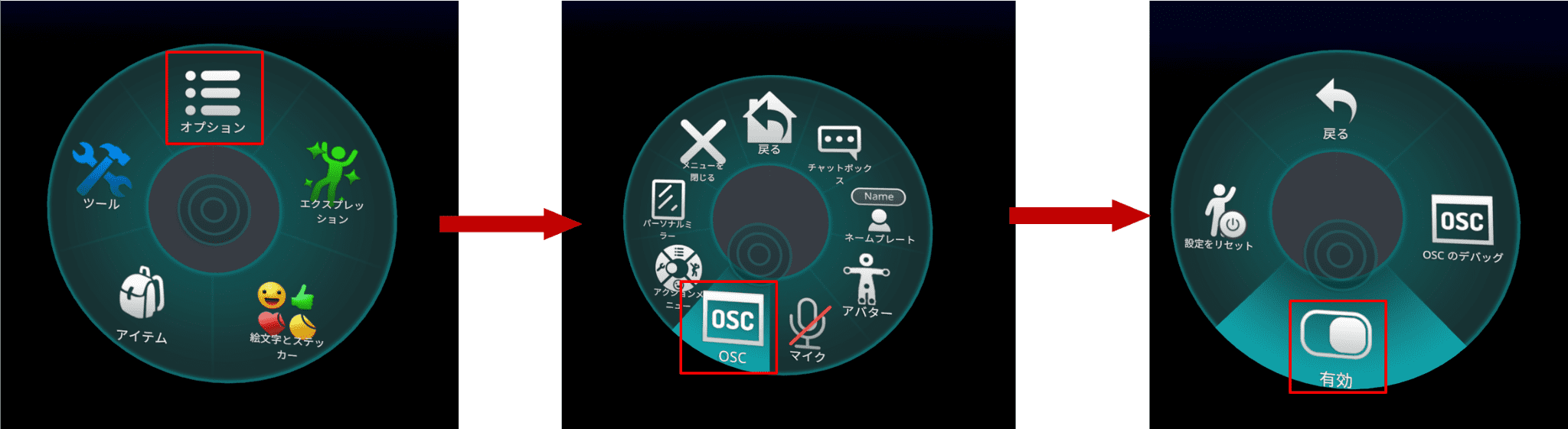 VRChatを起動し、Expressionメニューから「オプション」> 「OSC」とすすみ、有効化します。